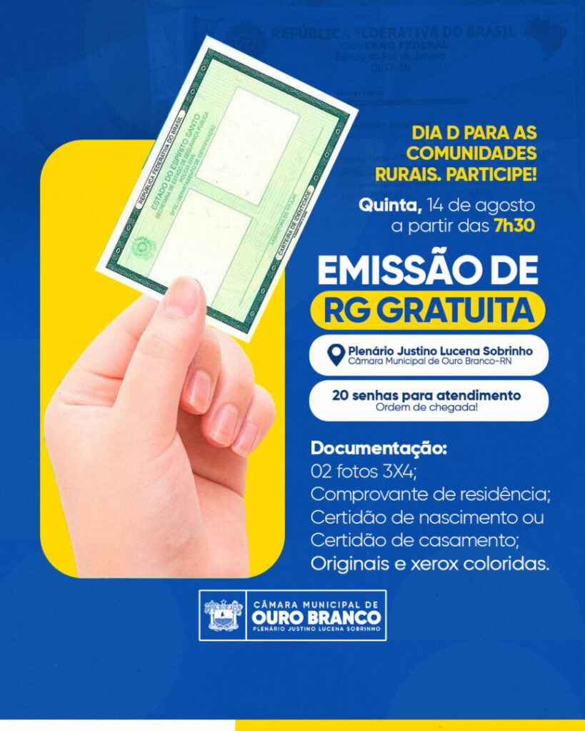 A Câmara Municipal de Ouro Branco informa que, nesta quinta-feira (14), será realizada a emissão de RG de forma exclusiva para os moradores das comunidades rurais do nosso município.