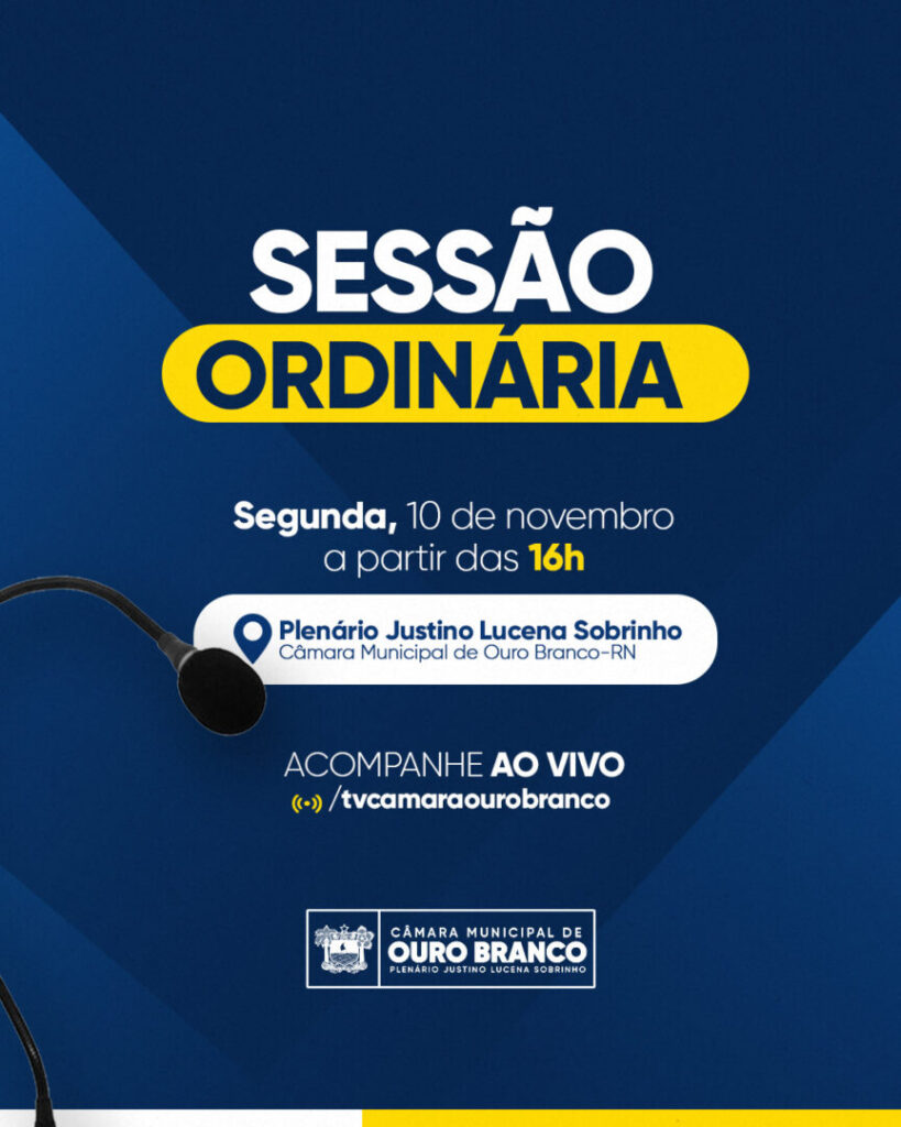 A Câmara Municipal de Ouro Branco realiza nesta segunda-feira, dia 10 de novembro, mais uma Sessão Ordinária. O encontro acontece no Plenário da Casa Legislativa, a partir das 16h, com transmissão ao vivo pelas redes sociais oficiais da Câmara.